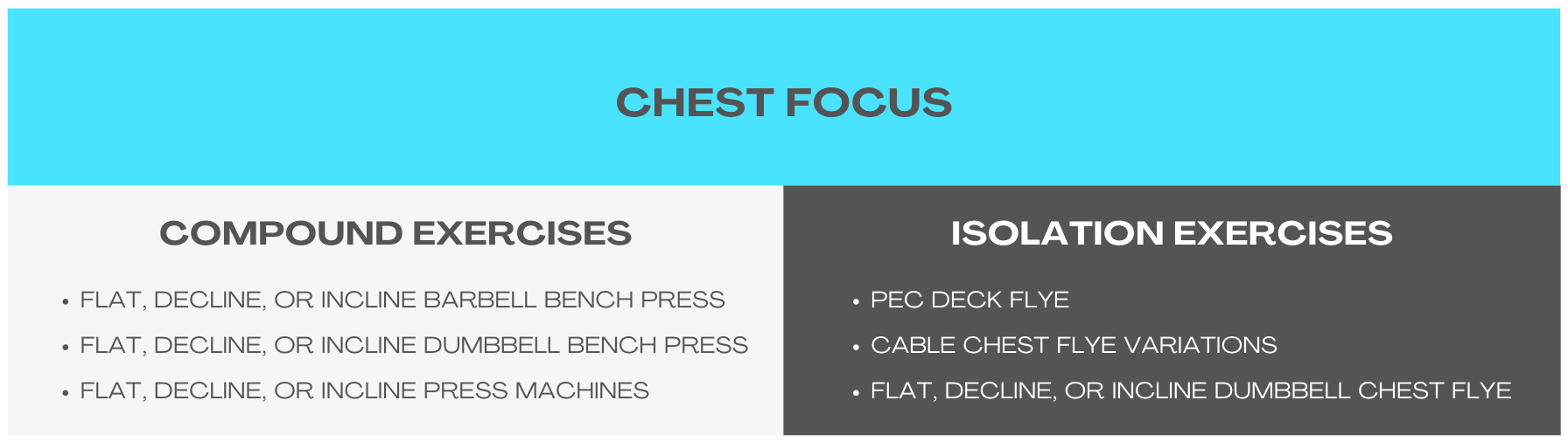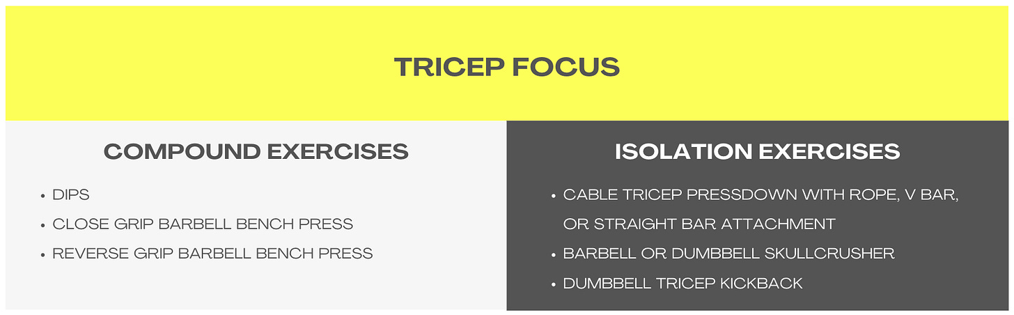 For example, if your training split calls for a chest and tricep day, you will be able to look at my lists, choose exercises under those muscle groups, and know you will be targeting the muscles you’re wanting to work and making correct choices.