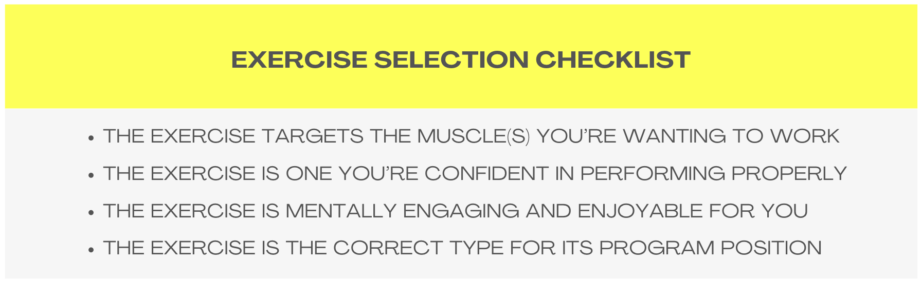 I’ve put together a checklist of items to consider when choosing your exercises and would like to go over each of the four items below.