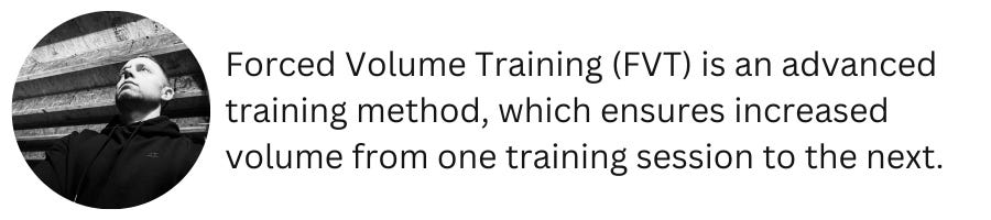 Forced Volume Training (FVT) is an advanced training method, which ensures increased volume from one training session to the next. This increased training volume produces gains in muscle size, strength, and work capacity.