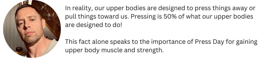 This fact alone speaks to the importance of a Press Day for gaining upper body muscle and strength.