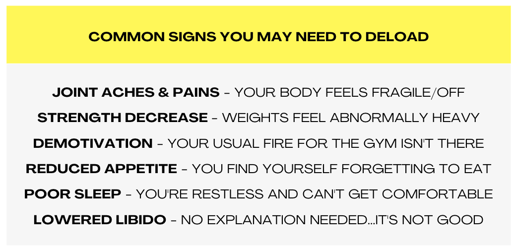 Looking at the list above, none of those signs are desirable and experiencing them isn't fun. You may not experience all of them at the same time, but it's likely you'll experience more than one and can make the call to deload before your recovery deficit gets bigger and more signs show up.