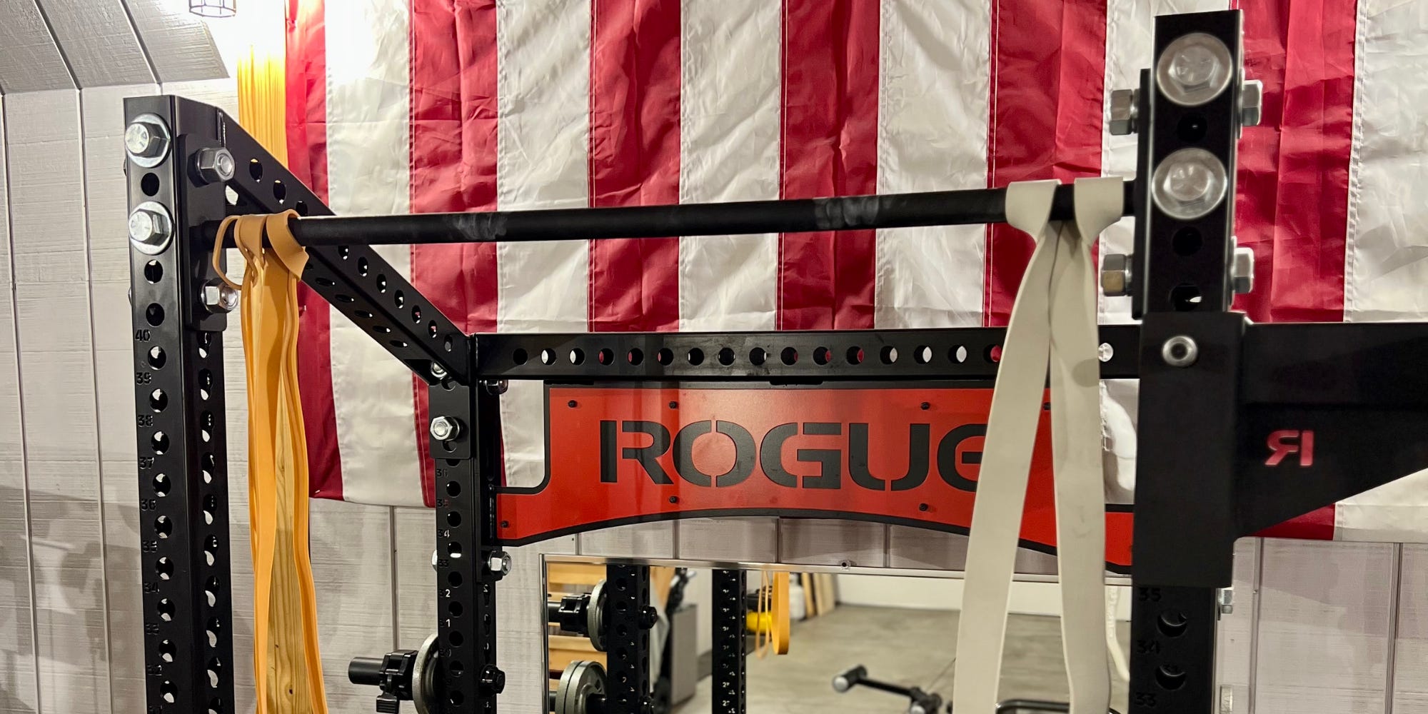 I decided to keep my legs nearly straight and bring my feet up to the Rogue logo cross bar of the squat rack to get more out of the exercise. This target is just a little lower than the pull-up bar, so it requires really lifting my legs up high.